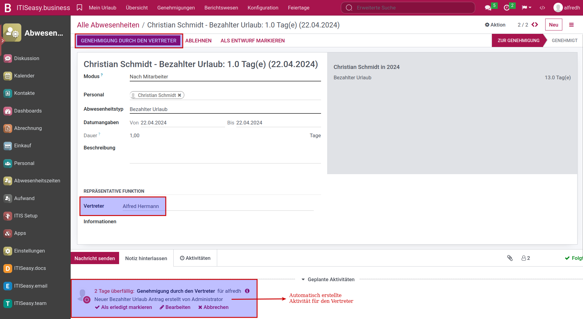 Wenn ein Vertreter in einer Urlaubsanfrage ausgewählt wird, muss der Vertreter die Anfrage bestätigen. Erst nach Bestätigung wird der Manager autorisiert, die Anfrage im nächsten Schritt zu genehmigen.