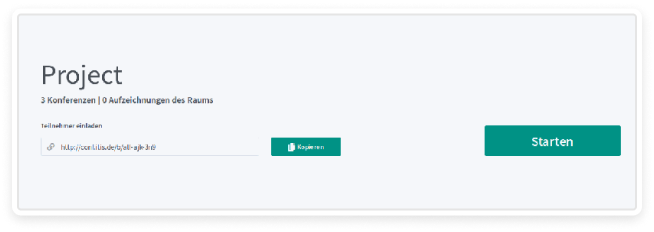 You can use the 'Copy' option to share the web conference link with colleagues or clients. By clicking the 'Start' button, you enter the conference room.